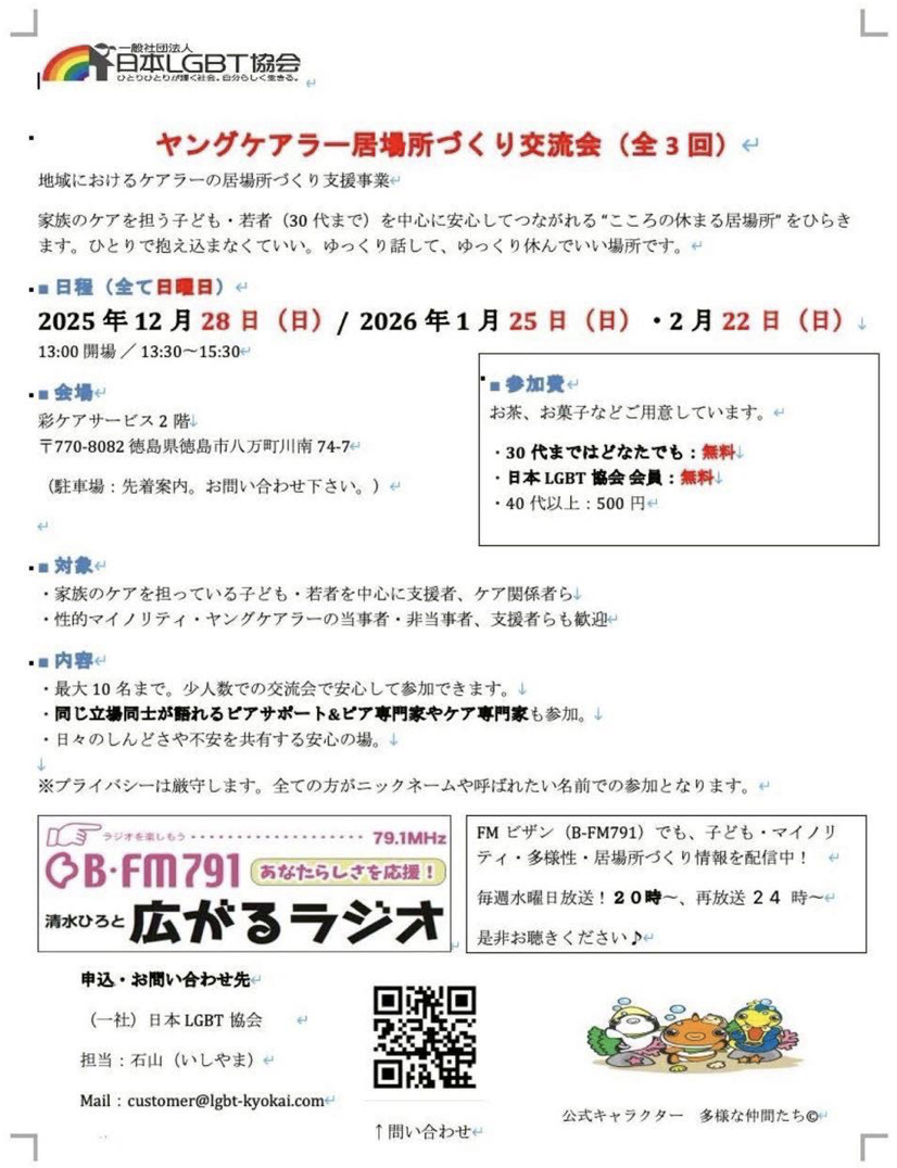 <テレビ徳島>2025年11月28日、29日、30日テレビトクシマにて放送がありました。内容:11月30日開催される地域でのLGBT Q講演会について◆番組名『ステップ』金曜日拡大版◆放送チャンネル111ch(テレビトクシマにご加入の方)121ch(徳島県全域のケーブルテレビにご加入の方) ◆放送日時 【 11月 28 日(金)】12時~[生放送]毎週金曜日 午後12:00~12:30(111chで放送)※放送日時等は都合により変更となる場合があります。◆...