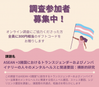 東アジア・東南アジア在住のトランスジェンダー・ノンバイナリーの人を対象として研究をすすめております。・対象:出生時の性別が自認する性と異なる方、トランスジェンダーまたはノンバイナリーと自認する方、21歳以上の方・対象国:カンボジア、香港、インドネシア、日本、韓国、ラオス、マレーシア、ミャンマー、フィリピン、シンガポール、台湾、タイ、ベトナム対象となる方がいらっしゃいましたら、研究にご協力をお願い...